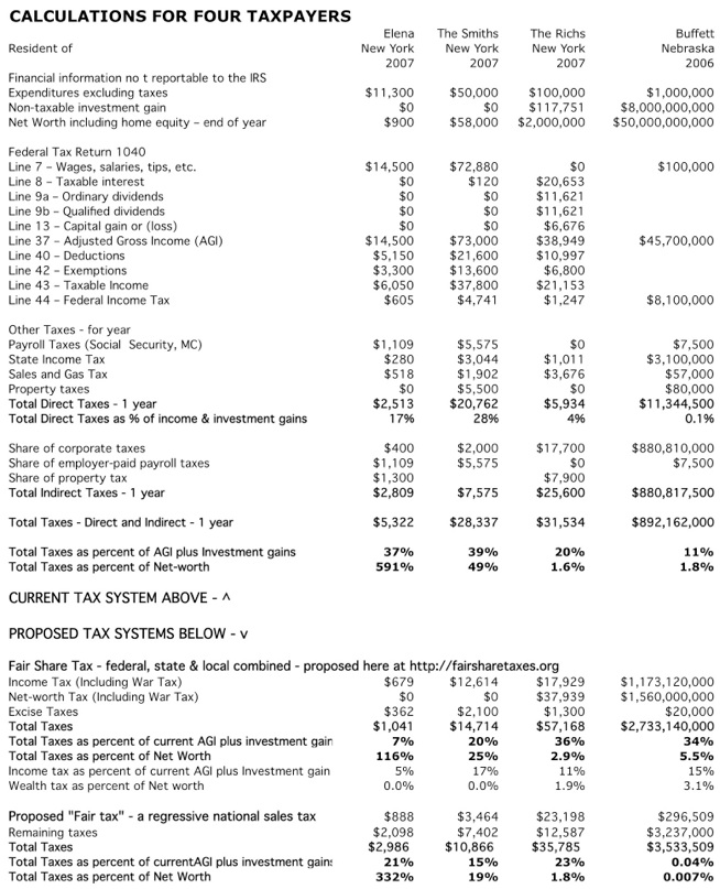 Elena, the Smiths and the Richs are typical, hypothetical taxpayers in 2006 or 2007. Warren Buffett's taxes are based on the personal tax information he disclosed for 2006 and his company's annual report. For all four, their financial situations and tax calculations are outlined on this page, the downloadable Four Taxpayer Spreadsheet.xls, and in the Tax Reform Essay.