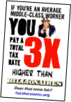 Billionaire Warren Buffett pays 12% total taxes (fed, state, local, and corporate) on estimated $36 million investment gains. A minimum-wage worker pays 34% total taxes on a $14,500 annual salary. This is not only unfair, but is destroying our economy and democracy. The top 1% already owns 40% of the nation's wealth. This leads to repeated investment bubbles and the recessions that are crushing the working-poor and middle-class. See this website for much more and a really fair, economy-fixing, nation-saving tax reform proposal, that would cut each middle-class household’s annual total tax bill by thousands and slash the deficit: http://fairsharetaxes.org