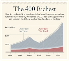 3. The top 400 income earners in the latest IRS report earned an average $260 million and paid an average federal income tax rate of 17% of their incomes, down from 30% in the early 1990's (see graph at right). Some in the top 400 pay no (0%) federal income tax, and nearly all make much more in investment gains that does not get counted as taxable income. They can avoid ever paying taxes on investment gains by not cashing them in, borrowing against them, and then passing the gains to their kids, at which point the gains can be cashed in tax-free. The top 400 pay little or no payroll (Social Security) taxes. Meanwhile America's typical (median) worker made $26,000 and paid 23.4% (vs. the top 400's 17%) of it in federal income and payroll taxes (link, link, link)